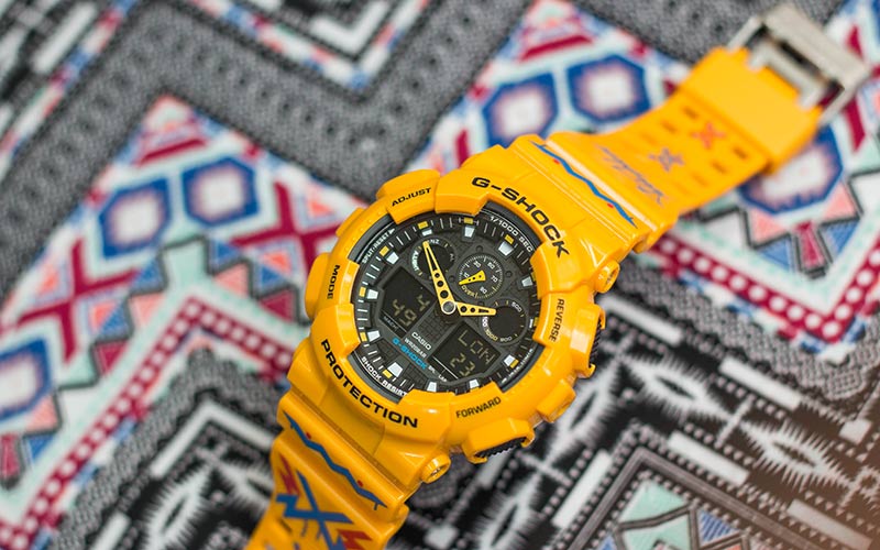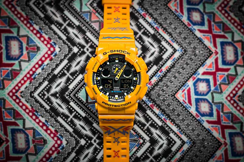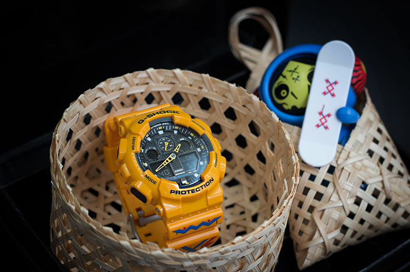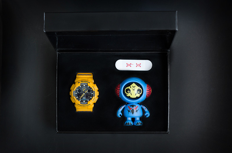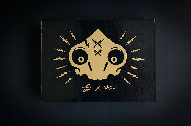 แค่ตัวกล่องของนาฬิกาก็มีลูกเล่นที่สามารถดึงดูดเราได้ทันทีตั้งแต่แรกเห็น กับดีไซน์คาแรคเตอร์กิ้งก่าคามิลเลี่ยนสีสันสดใส พอเปิดตัวกล่องออกมาเราจะเจอกล่องสีดำที่เป็นหัวกะโหลกของเจ้ากิ้งก่าคามิลเลี่ยนอีกหนึ่งชั้น จากนั้นเราจะพบกับพระเอกสำคัญของงานนี้ ซึ่งก็คือตัวเรือนนาฬิกาสีเหลืองที่ตัดกับลวดลายผ้าแบบชาวเขาสีสันสดใสดีไซน์ของ TIKKYWOW และของพรีเมี่ยมสุดพิเศษตัวโมเดลกิ้งก่าคามิลเลี่ยนในสไตล์ Street Culture ผลงานการออกแบบของ TIKKYWOW เอง G – Shock เรือนนี้จึงกลายเป็นผลงานศิลปะที่ผสมผสานเข้ากับของใช้ที่สามารถสร้างสไตล์ให้กับชีวิตประจำวันได้อย่างลงตัว