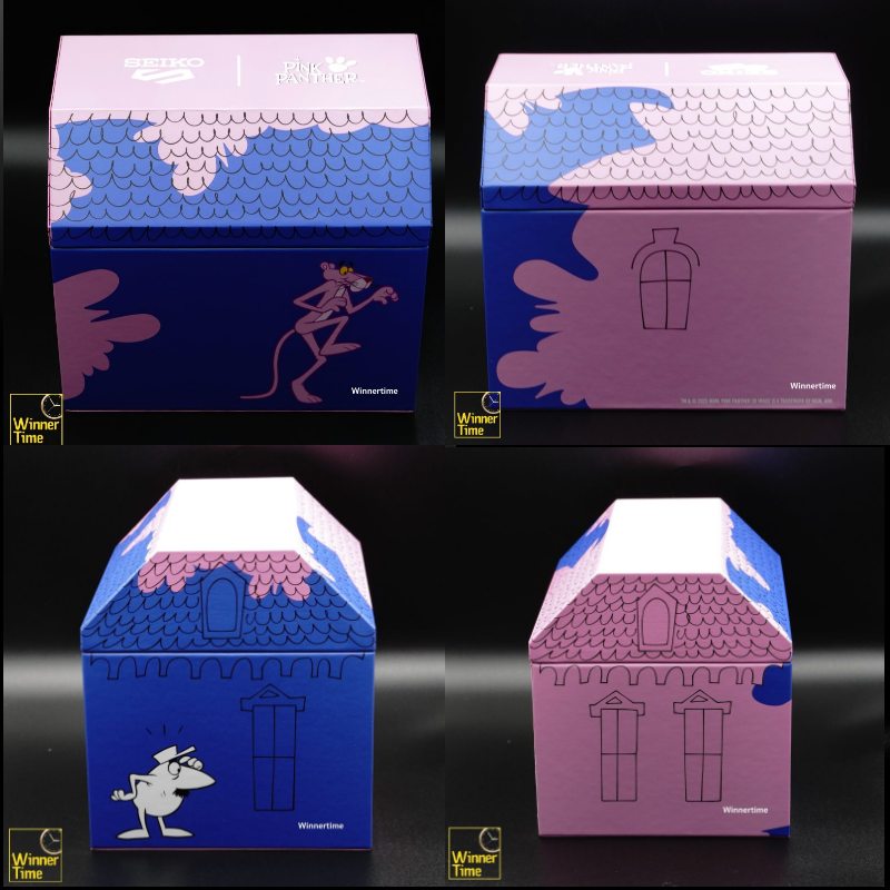 กล่องนาฬิกาที่ดีไซน์มาอย่างพิเศษ ได้รับแรงบันดาลใจจากบ้านของลิตเติ้ลแมนที่ถูกพิงค์แพนเธอร์ทาสีชมพู ดีไซน์น่ารักนี้แสดงให้เห็นถึงการต่อสู้สุดสนุกระหว่างพิงค์แพนเธอร์และลิตเติ้ลแมน